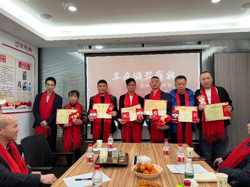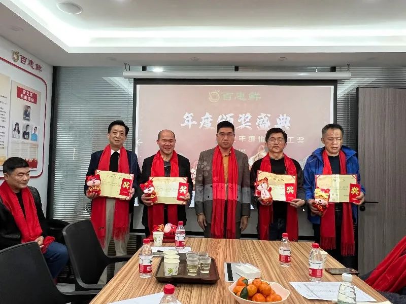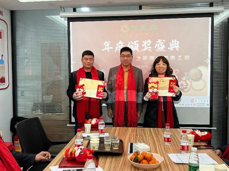 數(shù)年的堅(jiān)守不渝,默默耕耘,你們把最美好的青春韶華賦予了我們?yōu)橹餐瑠^斗的事業(yè),數(shù)年與企業(yè)同風(fēng)雨,共命運(yùn),衷心的感謝你們,正是因?yàn)槟銈兊母冻?,百惠鮮的今天才能如此絢麗!公司董事長王榮枝先生為忠誠功勛獎獲獎?wù)哳C獎。